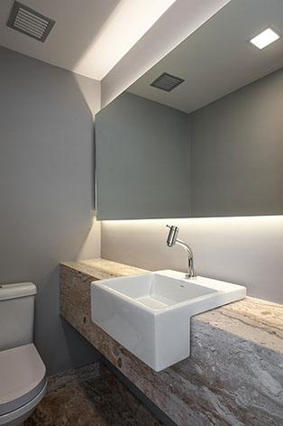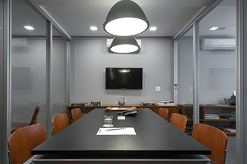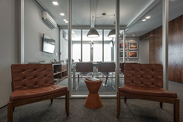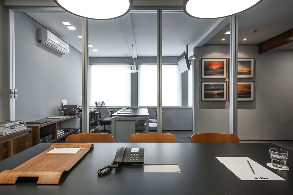 O projeto foi desenvolvido em uma sala comercial de alto padrão. Os ambientes foram separados por divisórias de vidro e por painéis de madeira Pau Ferro com a intenção de tornar o espaço mais acolhedor. O mobiliário é da Securit e Fernando Jaeger.