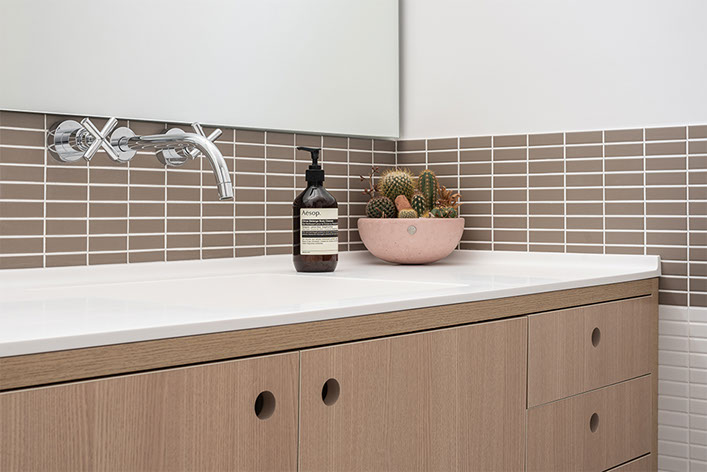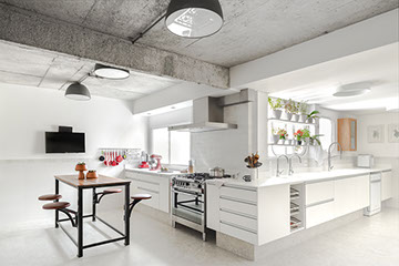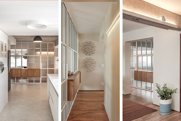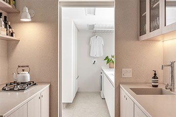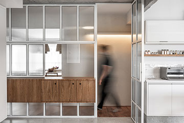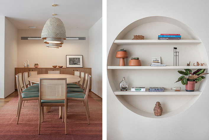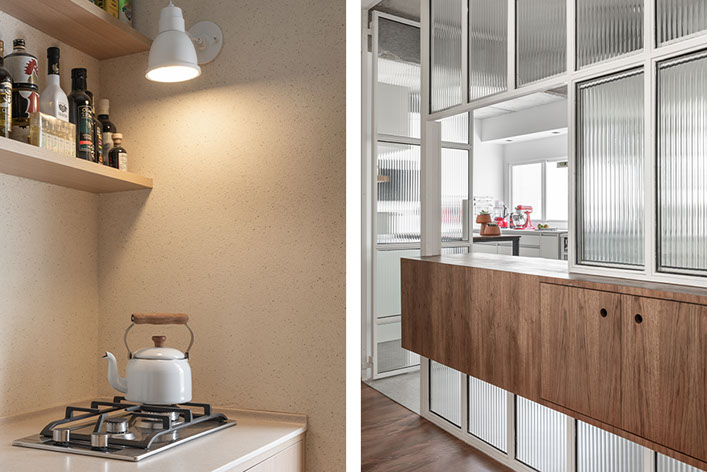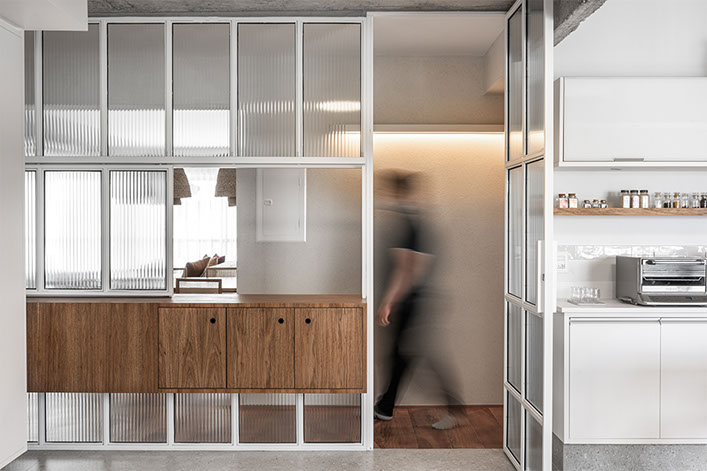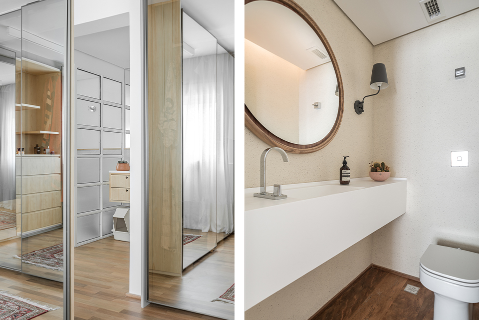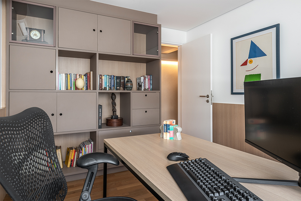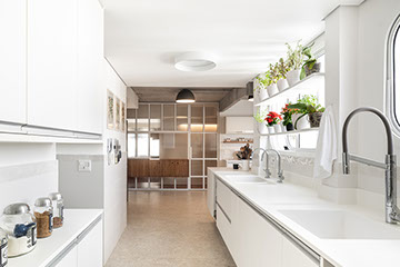 Com a demolição de um dos quartos a cozinha foi ampliada e ganhou uma ligação com a sala de jantar, através do móvel suspenso e janela em serralheria, projetados pelo estúdio. A cliente também ganhou um generoso closet, uma lavanderia maior, a sala de tv e o grande destaque: a ampla sala de estar unificada.