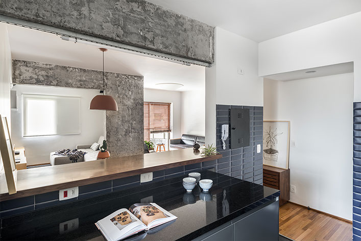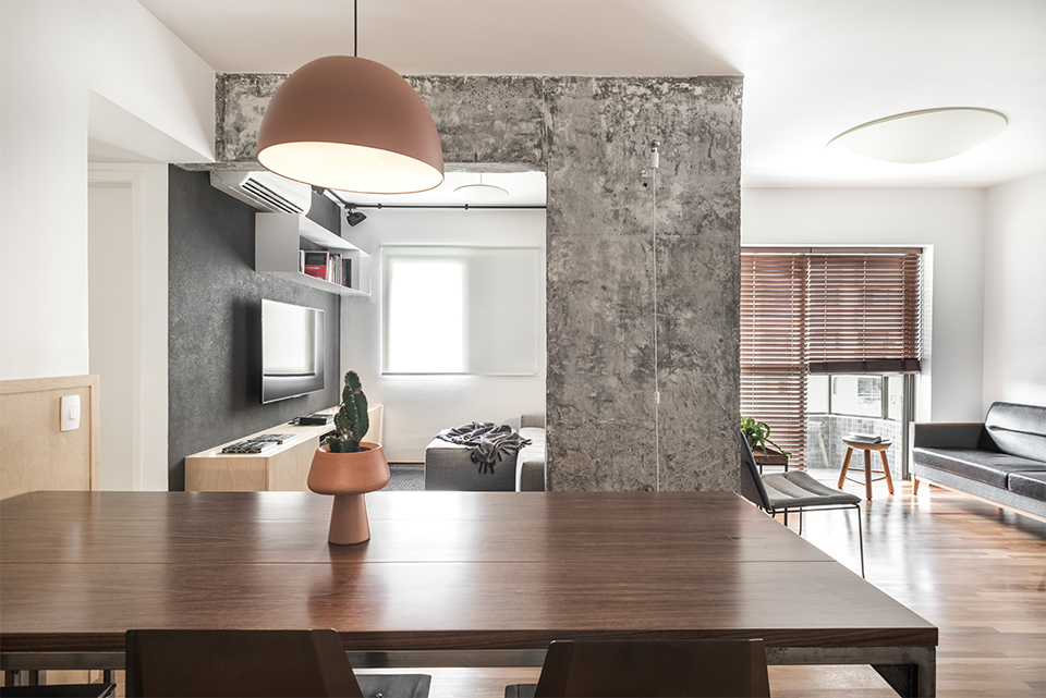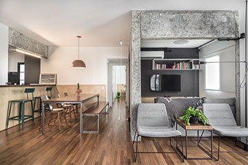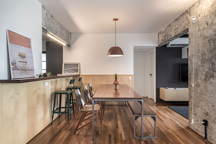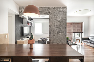 Esse apartamento de 80m² estava em seu estado original, com três dormitórios. O cliente usava um dos dormitórios como escritório. Integramos este dormitório para a sala de estar, o que nos possibilitou dobrar a metragem da área social. Conseguimos integrar as salas de estar e tv com a sala de jantar, deixando o espaço mais amplo, confortável e com mais iluminação natural. Fizemos uma abertura na alvenaria da cozinha criando uma comunicação entre os ambientes. Aproveitamos o dormitório de serviço existente e o abrimos para a suíte principal transformando-o em escritório. Todos os ambientes de área molhada receberam novos revestimentos e acabamentos.