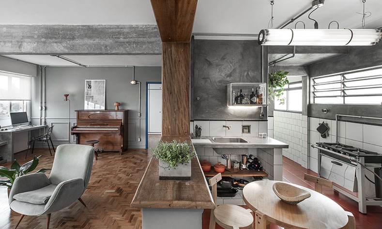 A reforma deste apartamento de 77m2 teve como objetivo principal dar amplitude ao imóvel. Para isso, um dormitório foi demolido e a área social ganhou mais espaço. A cozinha, então, ganhou um rasgo para se comunicar com a nova generosa área. O PM Arquitetura optou por manter os revestimentos originais da cozinha, porque além de trazer economia à obra, as peças estavam dentro do que era previsto para a nova identidade do local. Detalhe para a luminária da cozinha, desenvolvida pelo estúdio (ver em produtos). Foi criada uma bancada de concreto na cozinha, na bancada do banheiro da suíte e um banco de concreto em toda lateral da área social e na extremidade, este banco se transforma em uma bancada de trabalho.