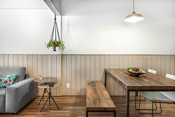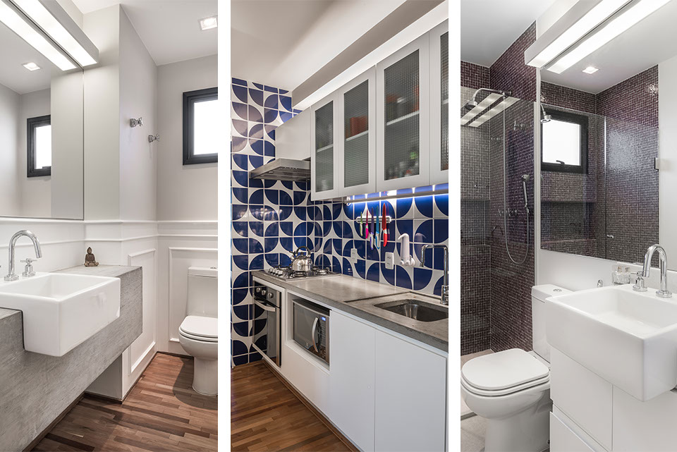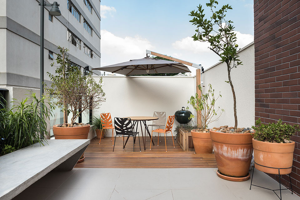 Um projeto 2 em 1! Dois apartamentos projetados para duas filhas de um cliente: ambos ficam no primeiro andar do edifício e tem plantas espelhadas. Cada um tem aproximadamente 58m2 e contam com um grande terraço de 36m2. A unidade dos projetos tem o seu elo nos dois grandes terraços, com a criação de dois bancos de concreto que percorrem quase toda a extensão destas áreas até os decks de madeira localizados nas extremidades do espaço. E, para trazer mais privacidade ao local, o banco foi aproveitado para a criação de uma floreira embutida no mesmo volume. O muro que divide os apartamentos foi revestido com madeira ripada e duas portas ocultas foram criadas para oferecer a possibilidade de interligar os dois terraços quando for de vontade de suas moradoras. O PM Arquitetura conseguiu explorar layouts similares com acabamentos completamente distintos. Cada apartamento foi adequado à identidade e à personalidade de cada uma das meninas.