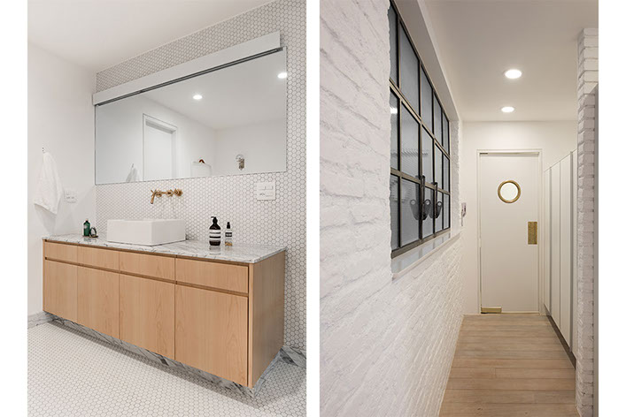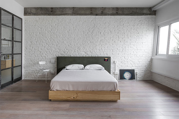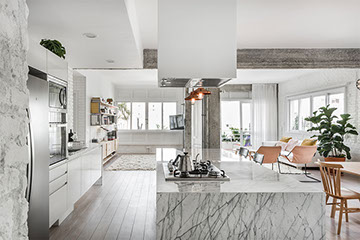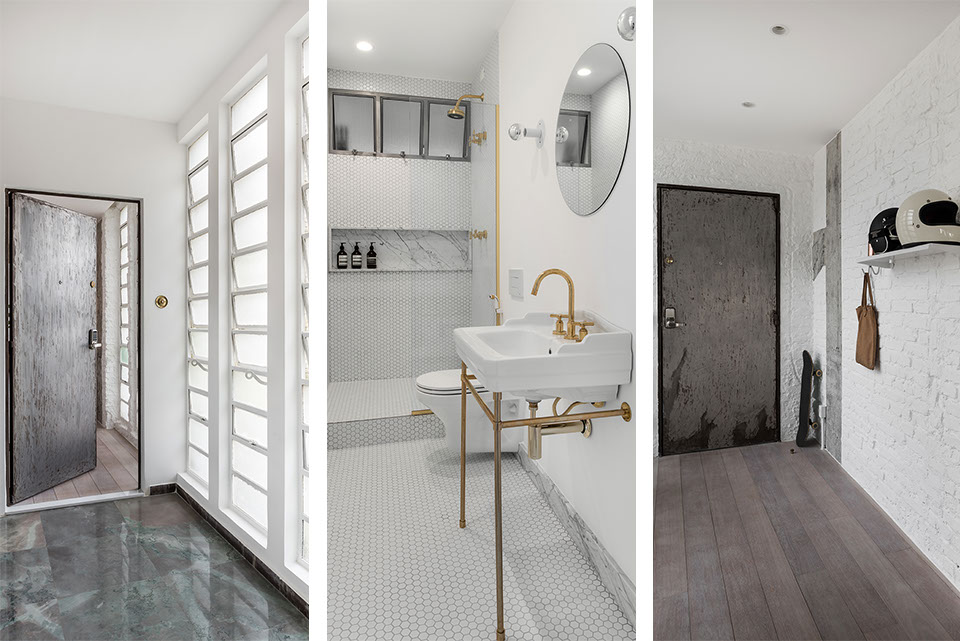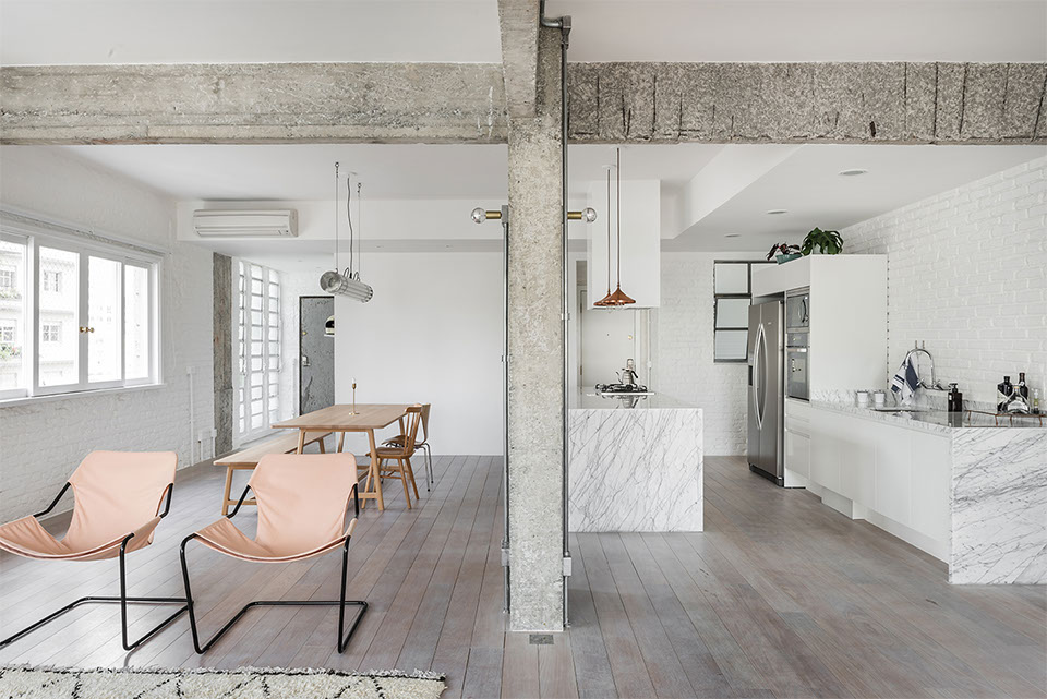 Minimalista e nórdico, com predominância do branco, do concreto, do aço e da madeira clara. Esses foram os conceitos adotados para a idealização do Projeto Parque das Hortênsias pelo PM Arquitetura. O apartamento foi encontrado todo descaracterizado do projeto original, de Artacho Jurado. Estava fragmentado, tinha forro de gesso baixo em todos os ambientes, o que comprimia os espaços. Inicialmente, todas as alvenarias internas, forros, pisos e contrapisos foram demolidos. Além disso, as paredes do entorno do apartamento foram descascadas para que os tijolos originais e suas imperfeições fossem destacadas, bem como os vigamentos e os pilares. Ainda para resgatar parte da antiga identidade, os elementos originais, como o mármore do hall social, a campainha de latão, as luminárias e o ladrilho hexagonal do terraço foram restaurados.