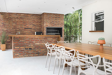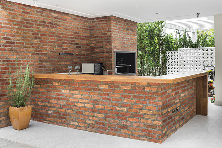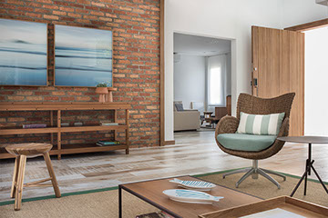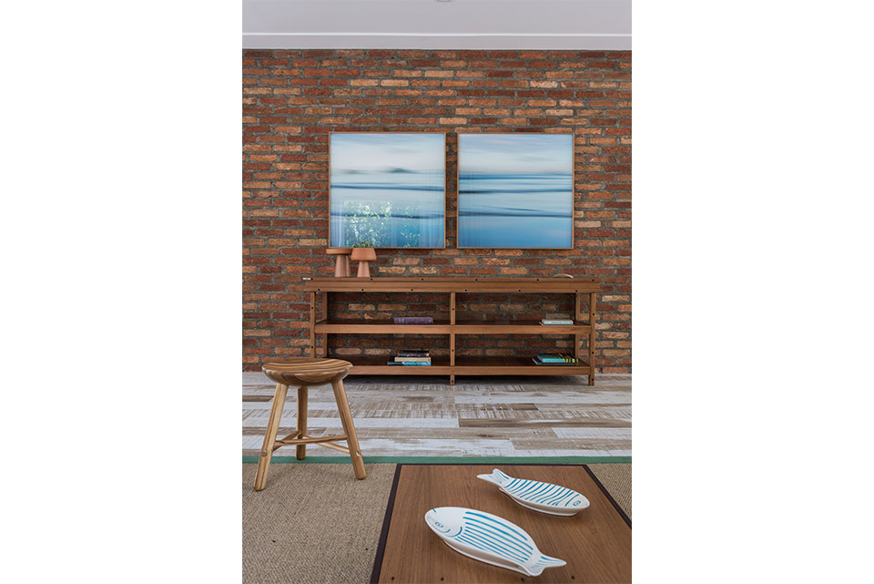 Esta casa, de aproximadamente 300m² de área construída, foi concebida por um engenheiro que atua na região. Nossa intervenção mais relevante foi em toda a área social, na escolha dos novos revestimentos, acabamentos e mobiliário geral. Modificamos parte da implantação e, consequentemente, o layout da área da churrasqueira, varanda da piscina, cozinha, living, home theater e suíte inferior, além de conseguir incorporar neste programa uma lavanderia coberta e uma banho de serviço. Alteramos todos os caixilhos e portas de passagem por modelos mais elegantes. Optamos por novos elementos de madeira de demolição, mobiliários de madeira, painéis e banheiros com revestimentos de ladrilho hidráulico, com paginação exclusiva criada pelo nosso Estúdio, e painéis de tijolos de demolição, destacando todas as suas imperfeições, para criar uma atmosfera mais descontraída com clima de praia, exatamente o toque que faltava a esta casa. Optamos pelos armários da cozinha na cor verde garrafa para dar personalidade e, ao mesmo tempo, dar continuidade à essa nova atmosfera.