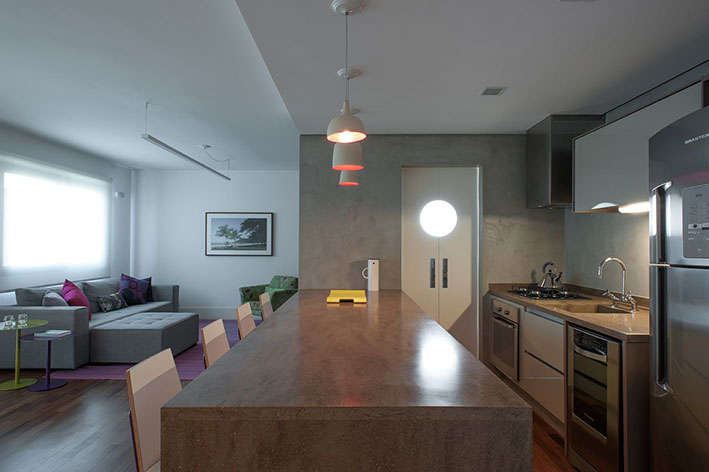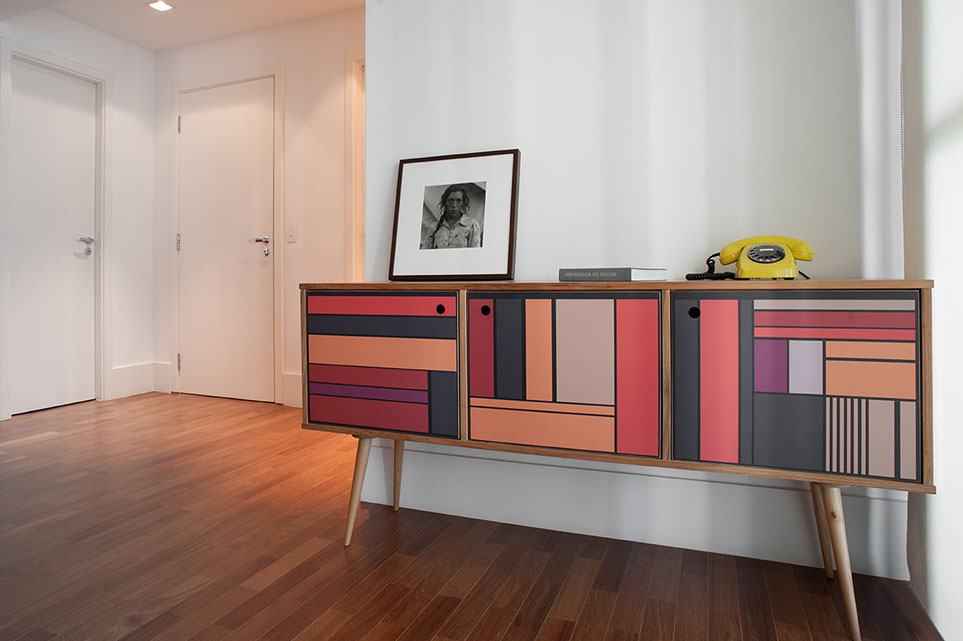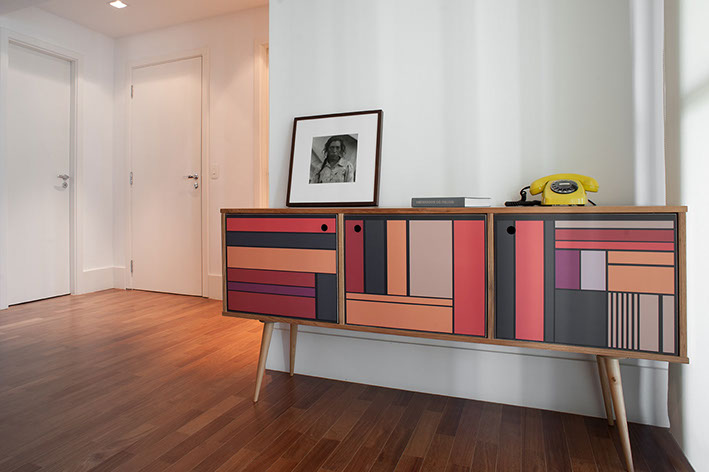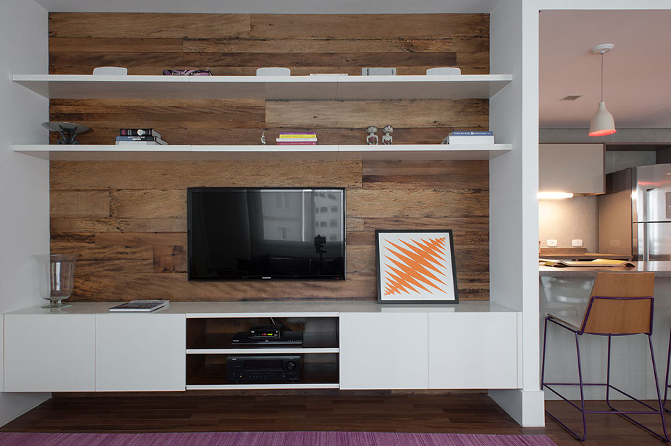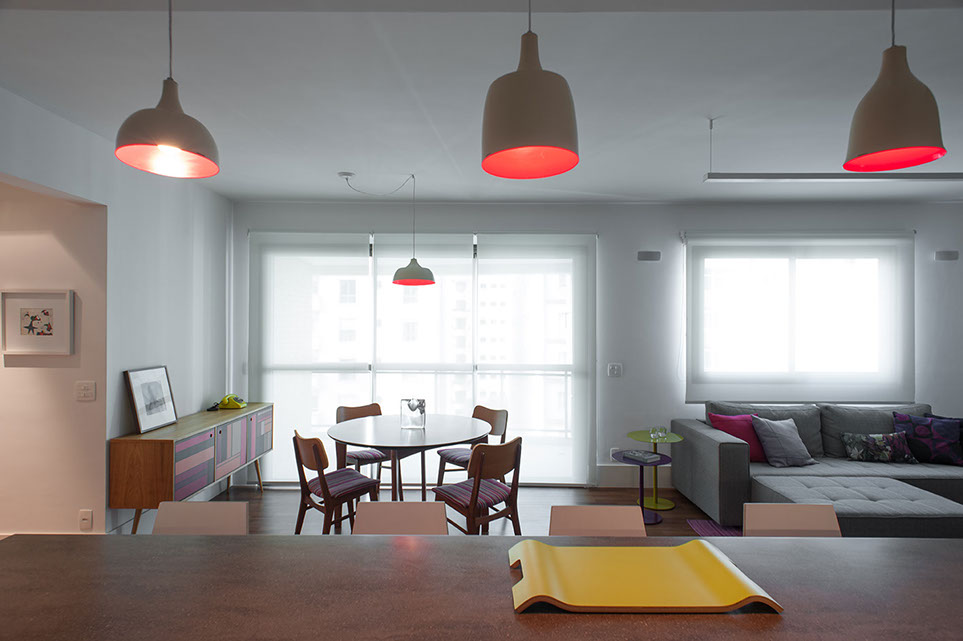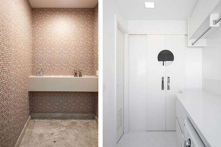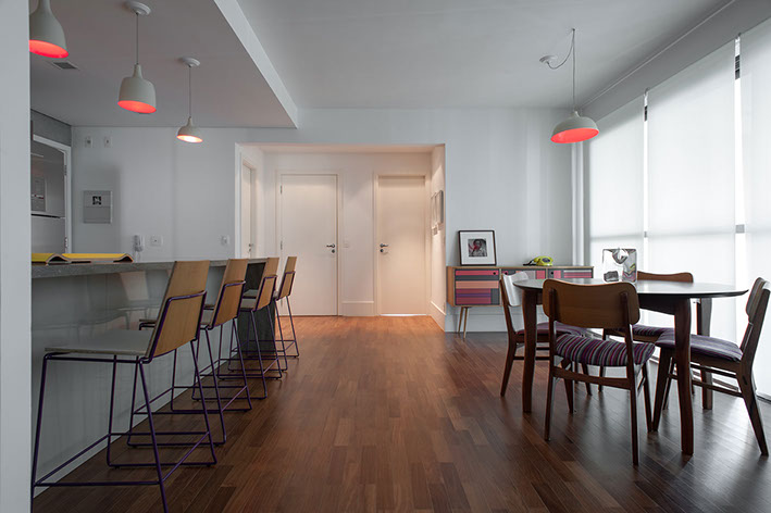 Esse apartamento, de 110m2, foi projetado para uma jovem recém-formada. O PM Arquitetura optou por integrar a área social à cozinha e criou uma área de serviço monocromática, toda branca, para trazer uma sensação clean, de limpeza e de organização. Os mobiliários das salas são Fernando Jaeger e os mobiliários e armários dos quartos foram desenhados pelo estúdio.