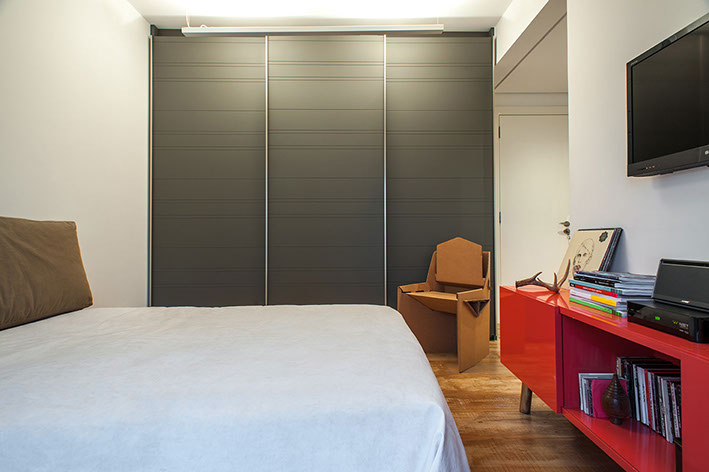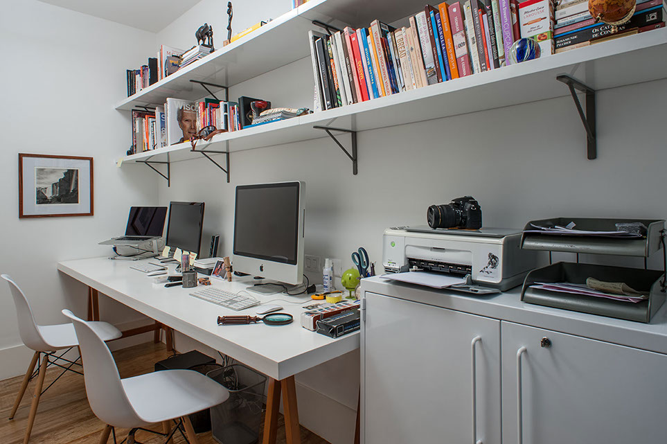 Esse apartamento era novo, com 210m2 e foi entregue pela construtora apenas com os revestimentos básicos. A área social foi ampliada, integrando parte da varanda ao corpo social (antiga área da churrasqueira). As suítes foram reformadas e os espaços, adequados possibilitando a criação de um escritório entre as suítes. A copa e cozinha foram integradas também com o objetivo de ampliar esta área. As bancadas de inox Mekal e a cozinha da Ornare trouxeram um ar sofisticado ao ambiente.