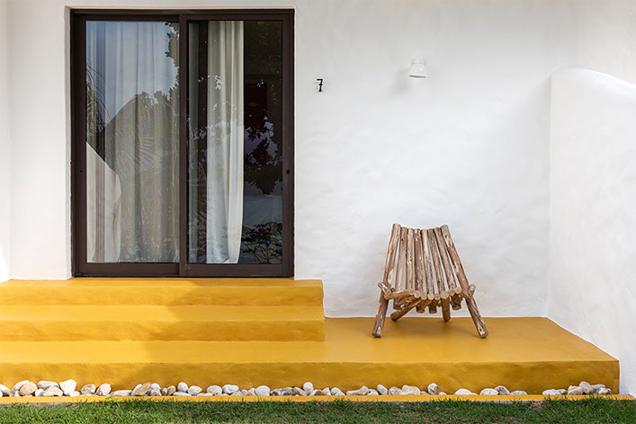 Predomínio do branco, massa curva branca, elementos rústicos, pisos em pedra basalto, massa cimentícia areia e amarelo queimado, sape e coberturas em eucalipto.