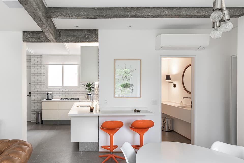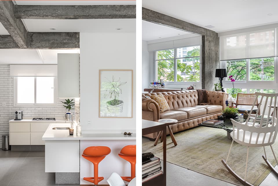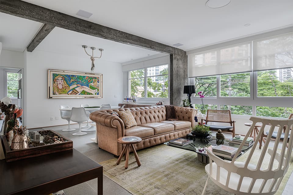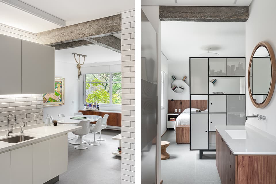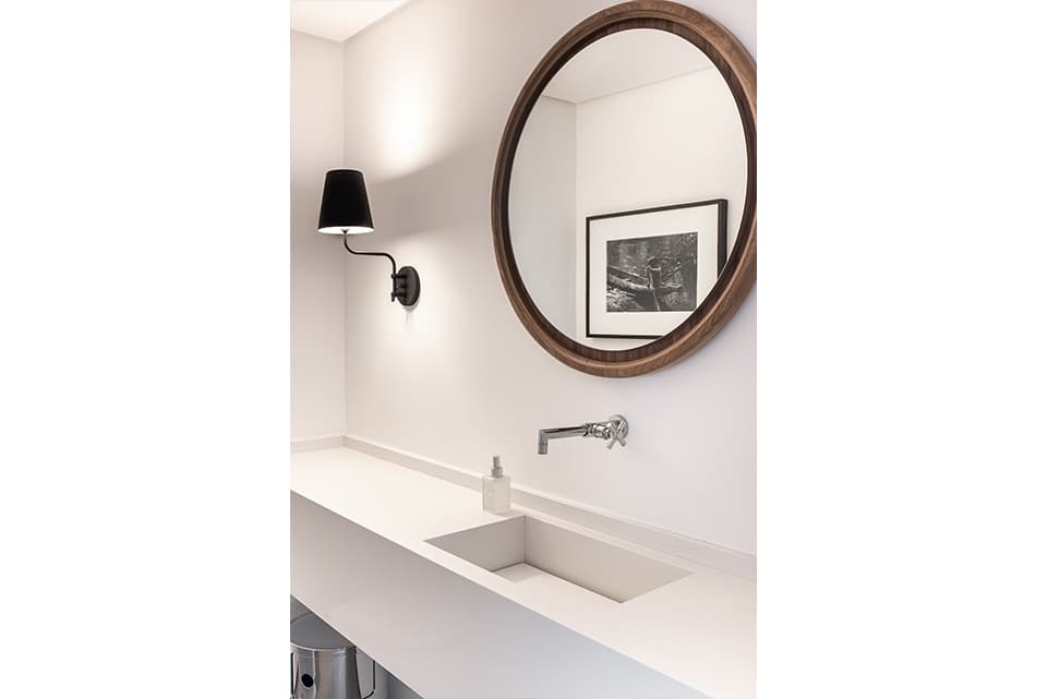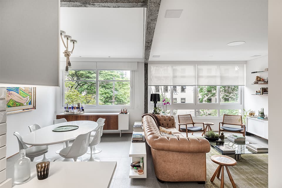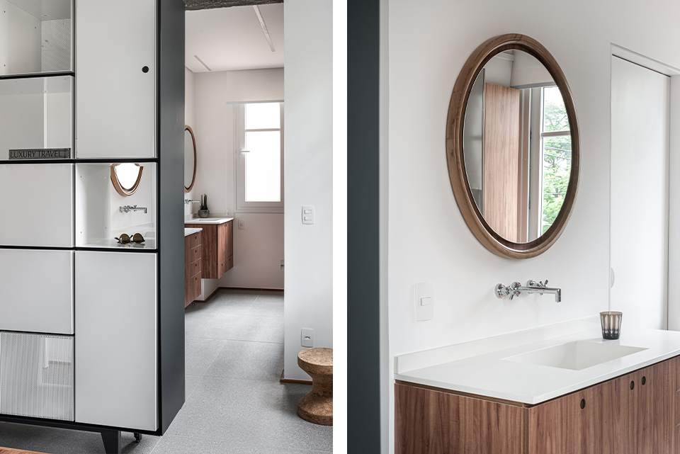 Algumas alterações na planta foram importantes para abrir e integrar a área social bem como transformar os banheiros existentes em um lavabo, banho de serviço e suíte. Outra atualização importante foi nos caixilhos do apartamento.