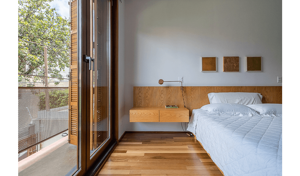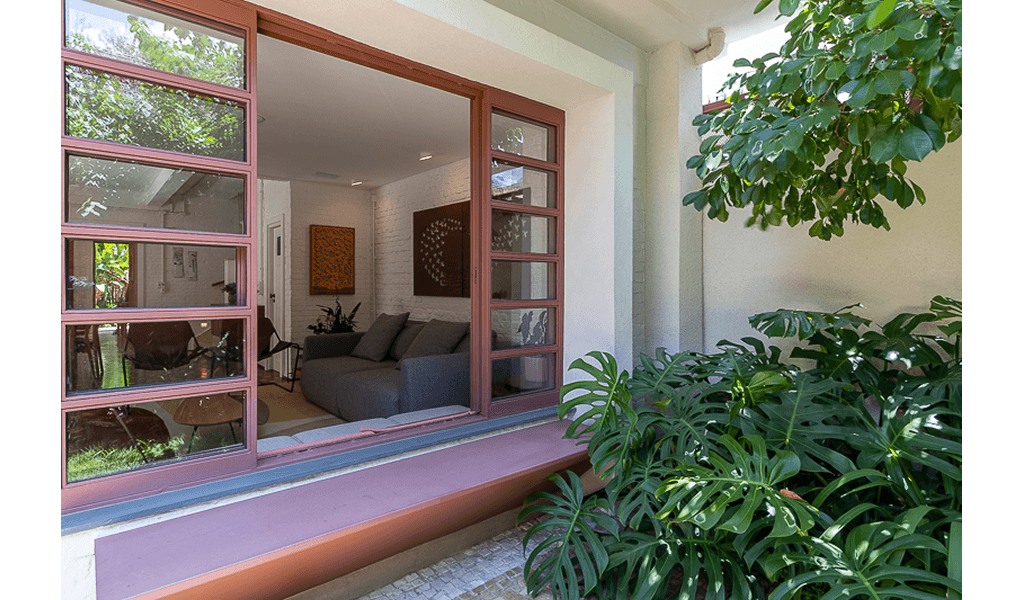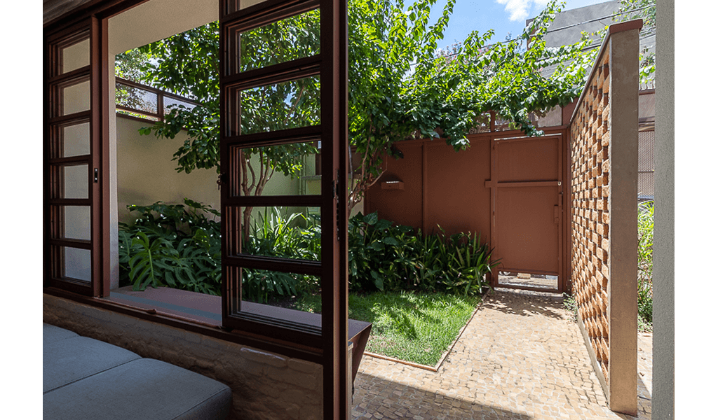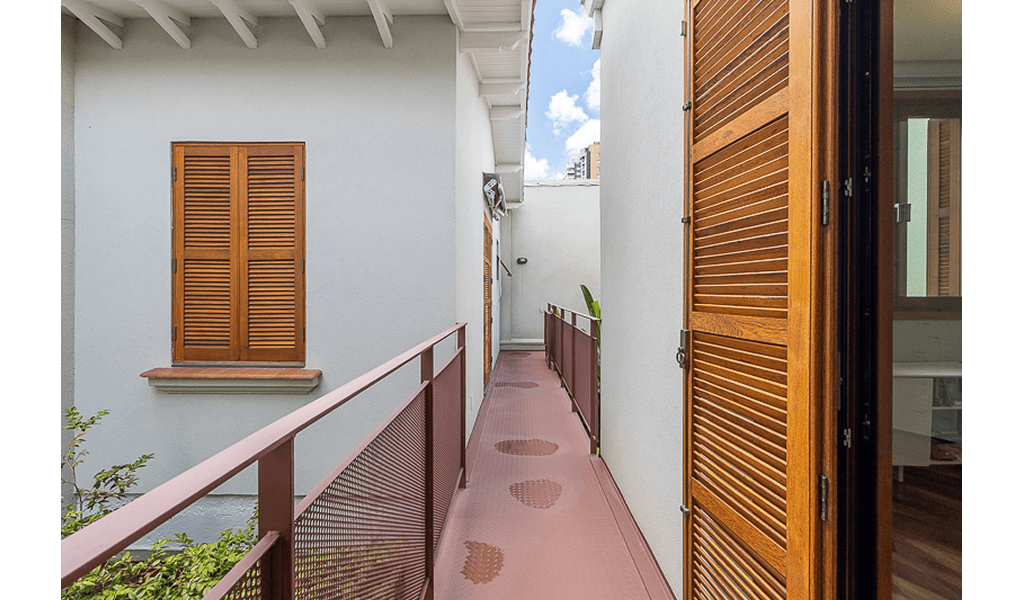 Para unir a casa principal à edícula projetamos uma passarela metálica na mesma cor dos novos caixilhos metálicos do pavimento térreo, essa passarela promove uma conexão coberta no térreo, enquanto no pavimento superior ela cria uma espécie de varanda entre os escritórios/ dormitórios, além de uma escada externa ao fundo.