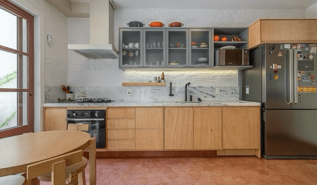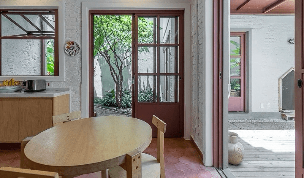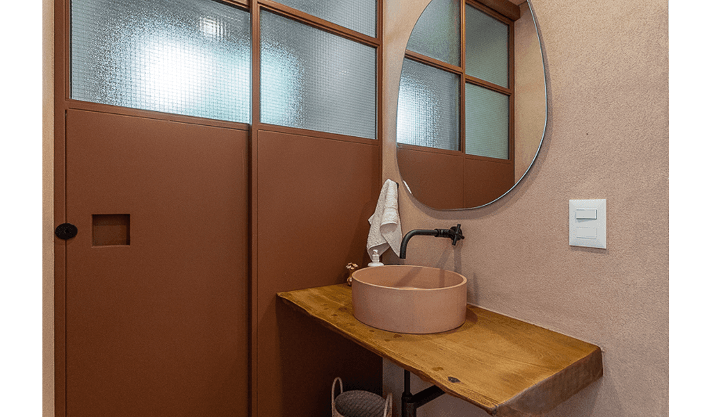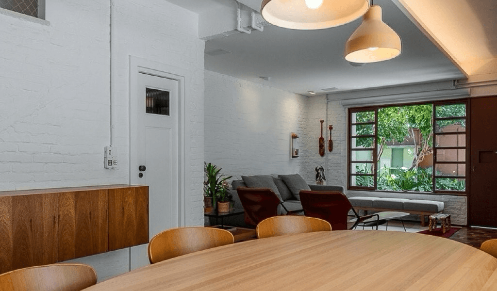 No pavimento inferior optamos por dar um ar mais rústico a casa deixando os tijolos originais aparentes, apenas com uma pintura na cor creme, tanto internamente como externamente, para destacar de forma suave a história da casa. Além de termos refeito toda a infraelétrica em eletrodutos aparentes na mesma cor das alvenarias e laje, optamos por trazer o elemento do concreto nas molduras das portas e janelas.