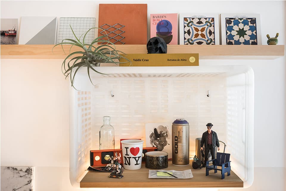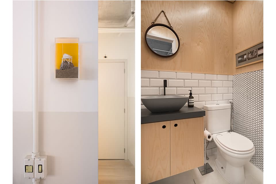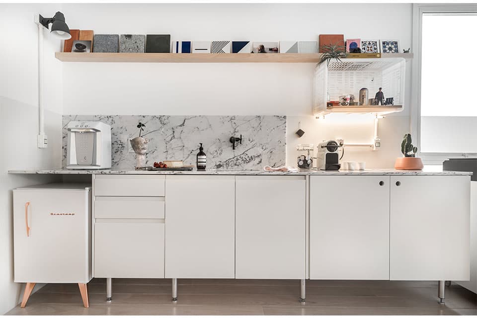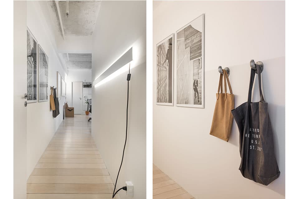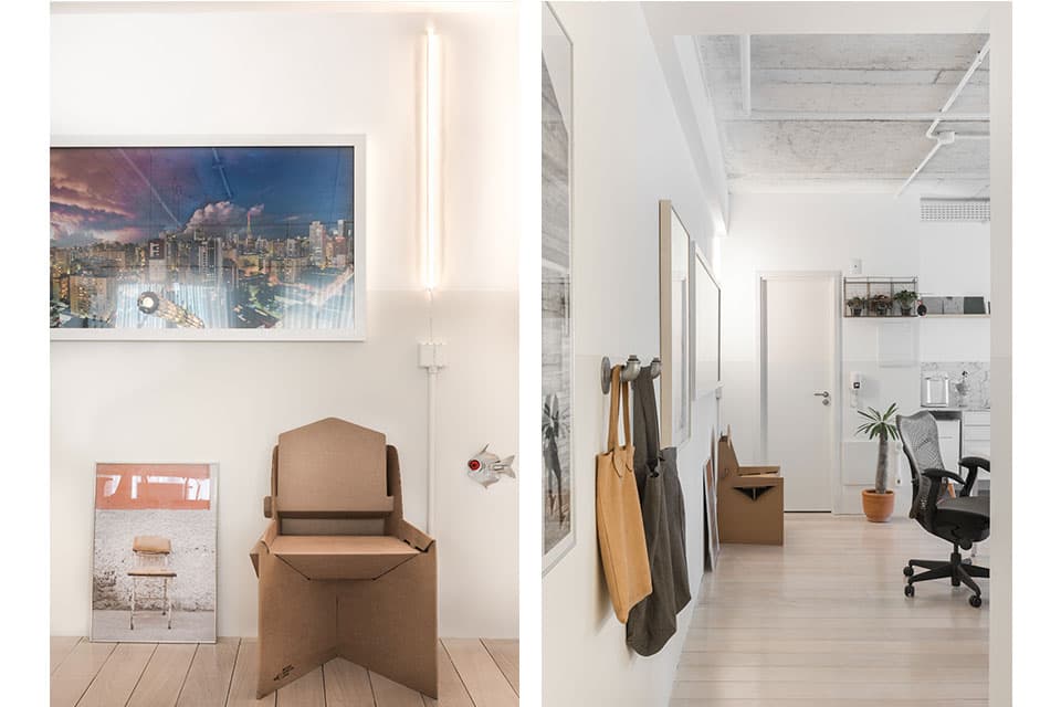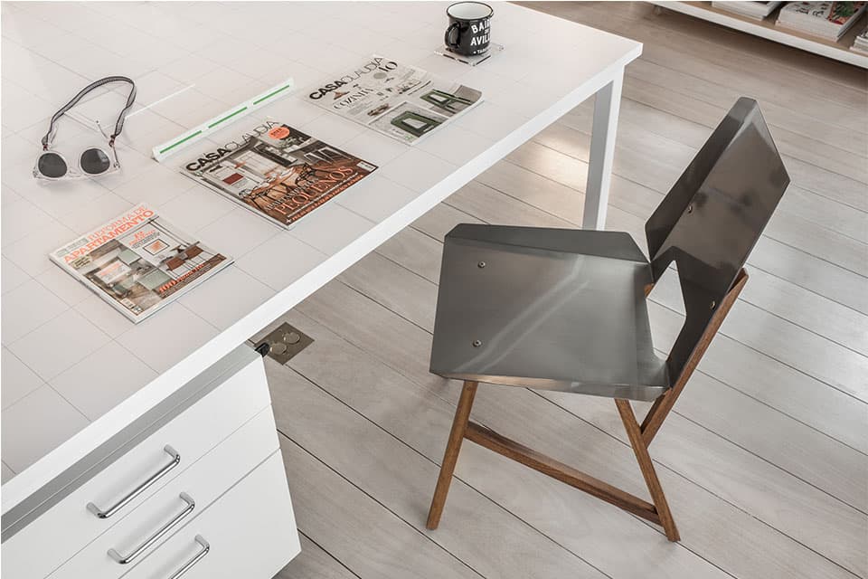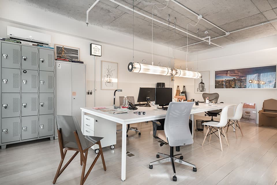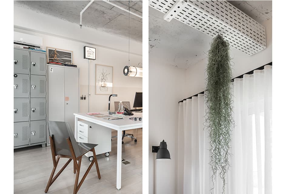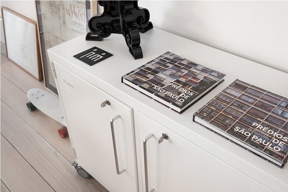 O projeto do nosso novo Estúdio é um resumo do nosso estilo de arquitetura e decoração. Minimalista, apenas com o essencial, o espaço tem predomínio do branco e de elementos industriais de maneira equilibrada. O assoalho de madeira tem o acabamento esbranquiçado, que é nossa marca em nossos projetos. O partido do projeto se desenvolveu em torno de uma grande mesa de trabalho central. Fizemos uma malha quadriculada sobre a mesa central que serve de acabamento e, principalmente, de referência de medida. É o xodó do escritório! As duas luminárias centrais são design da PM Arquitetura, clique aqui e veja fotos da luminária.