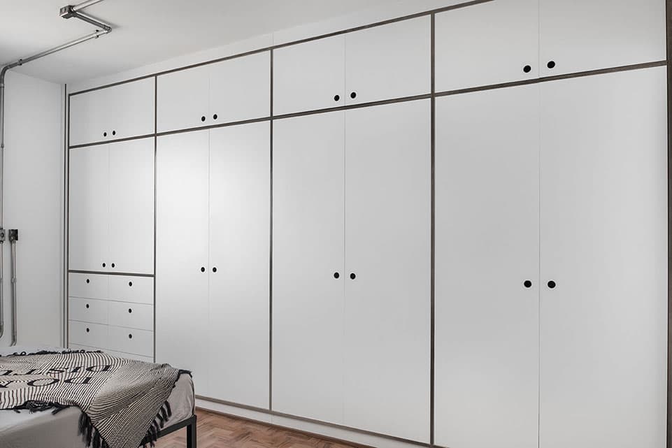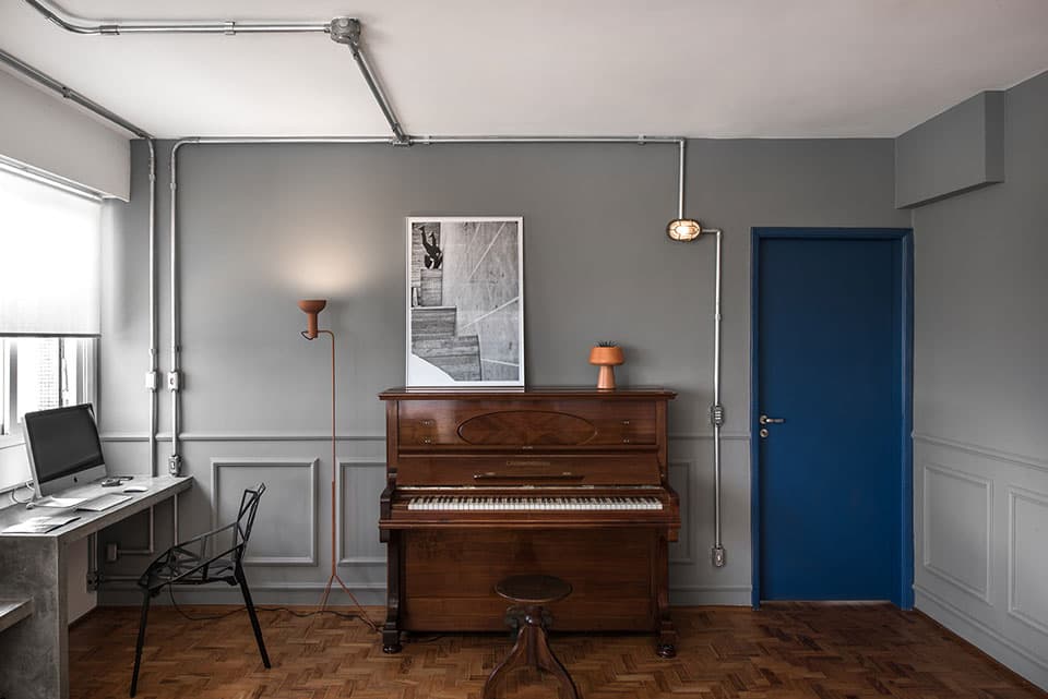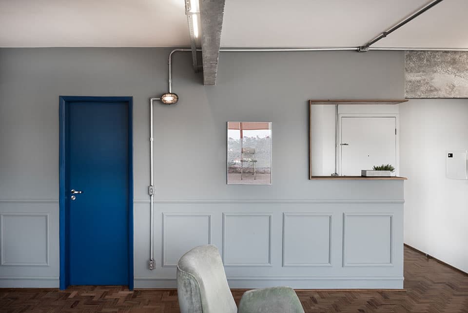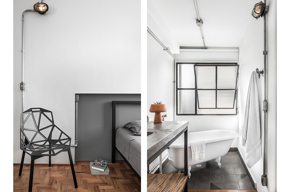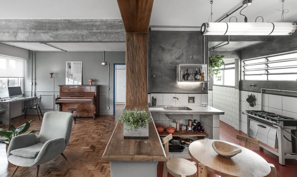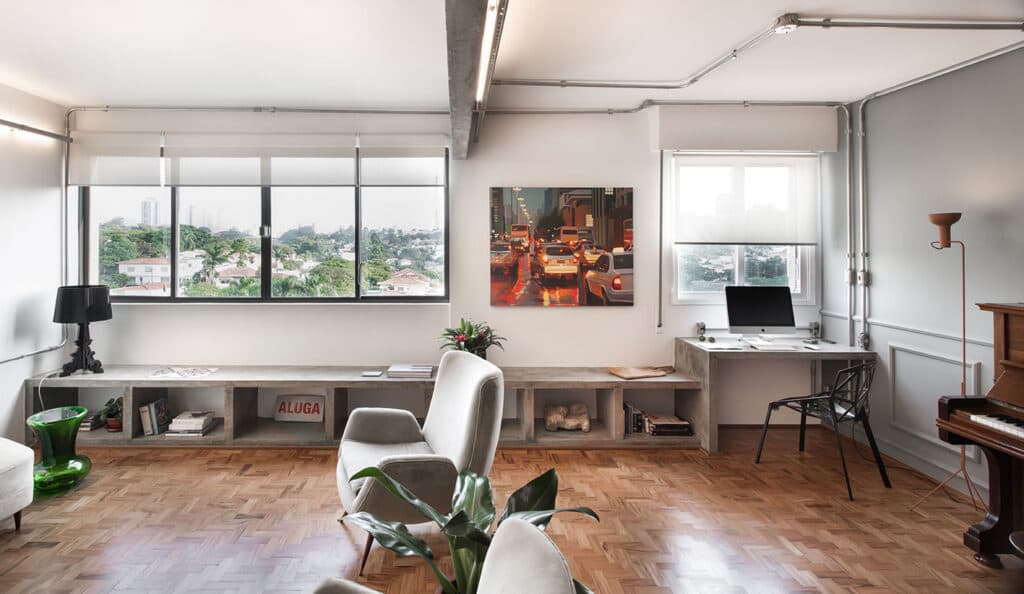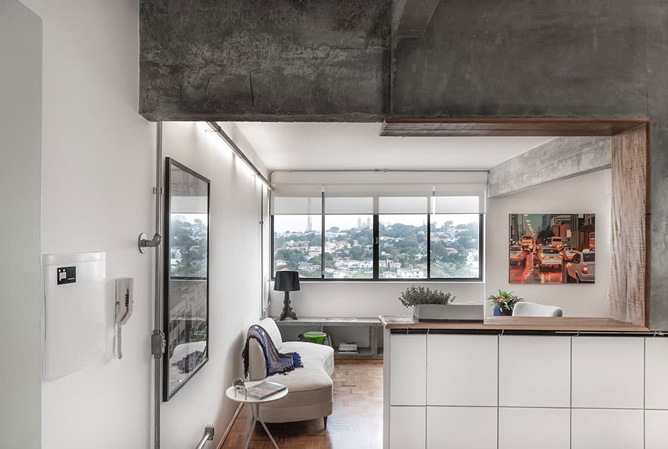 A reforma deste apartamento de 77m2 teve como objetivo principal dar amplitude ao imóvel. Para isso, um dormitório foi demolido e a área social ganhou mais espaço. A cozinha, então, ganhou um rasgo para se comunicar com a nova generosa área. O PM Arquitetura optou por manter os revestimentos originais da cozinha, porque além de trazer economia à obra, as peças estavam dentro do que era previsto para a nova identidade do local. Detalhe para a luminária da cozinha, desenvolvida pelo estúdio (ver em produtos). Foi criada uma bancada de concreto na cozinha, na bancada do banheiro da suíte e um banco de concreto em toda lateral da área social e na extremidade, este banco se transforma em uma bancada de trabalho.