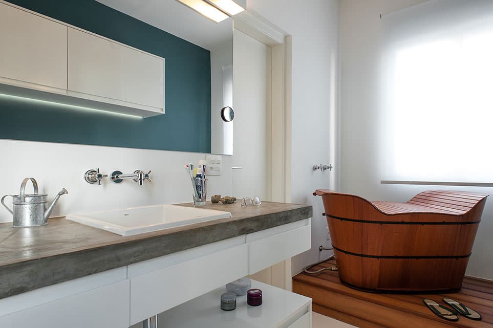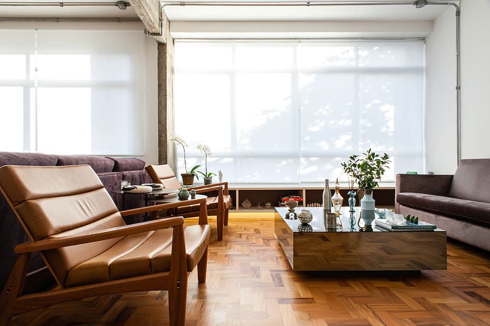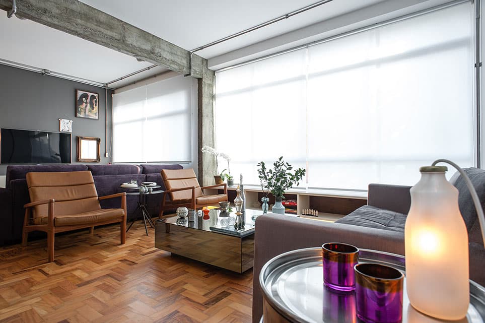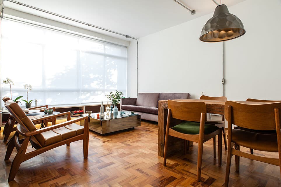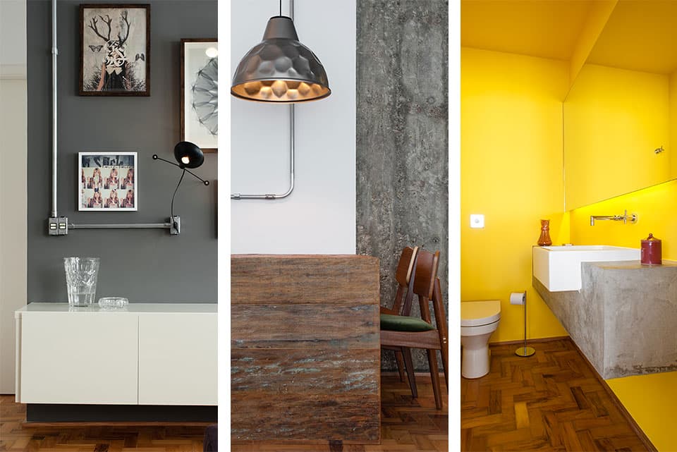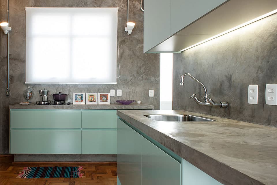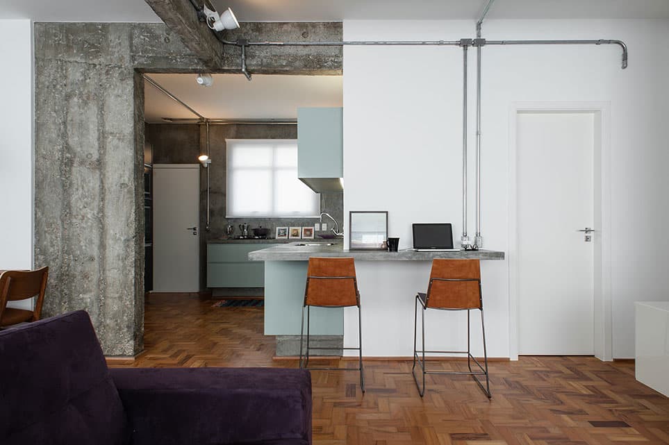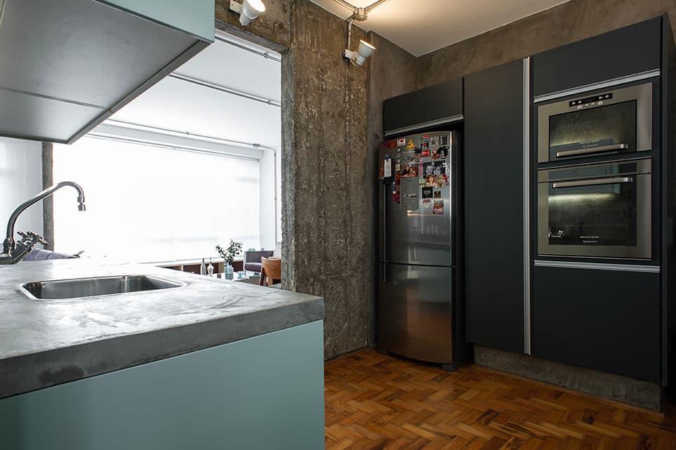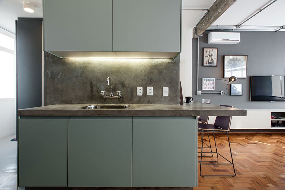 Com uma planta quadrada, ambientes relativamente confortáveis e pé direito generoso, foi um espaço fácil para o PM Arquitetura trabalhar. A cozinha foi integrada com a área social que, por sua vez, duplicou de tamanho em função da exclusão de um dormitório. Foi feita uma bancada em L de concreto para unir o tampo da cuba da cozinha com um balcão de apoio na sala, que pode ser usado para pequenas refeições ou para trabalhar. Como a cliente não tinha necessidade de ter mais de um dormitório, o de serviço foi eliminado e uma grande suíte foi criada, invertendo a posição dos banheiros.