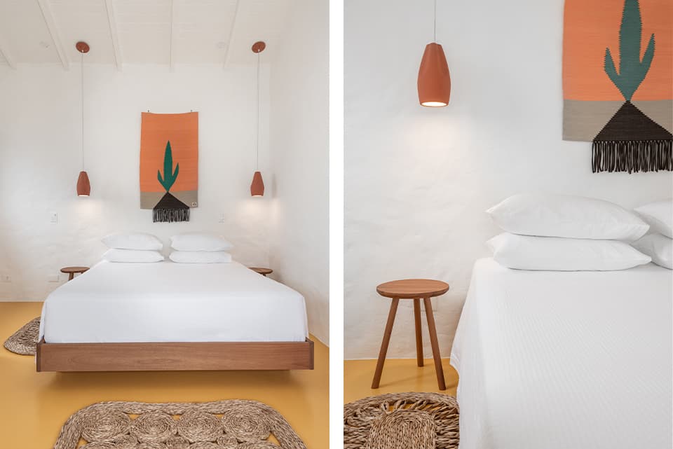 Predomínio do branco, massa curva branca, elementos rústicos, pisos em pedra basalto, massa cimentícia areia e amarelo queimado, sape e coberturas em eucalipto.