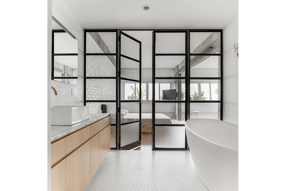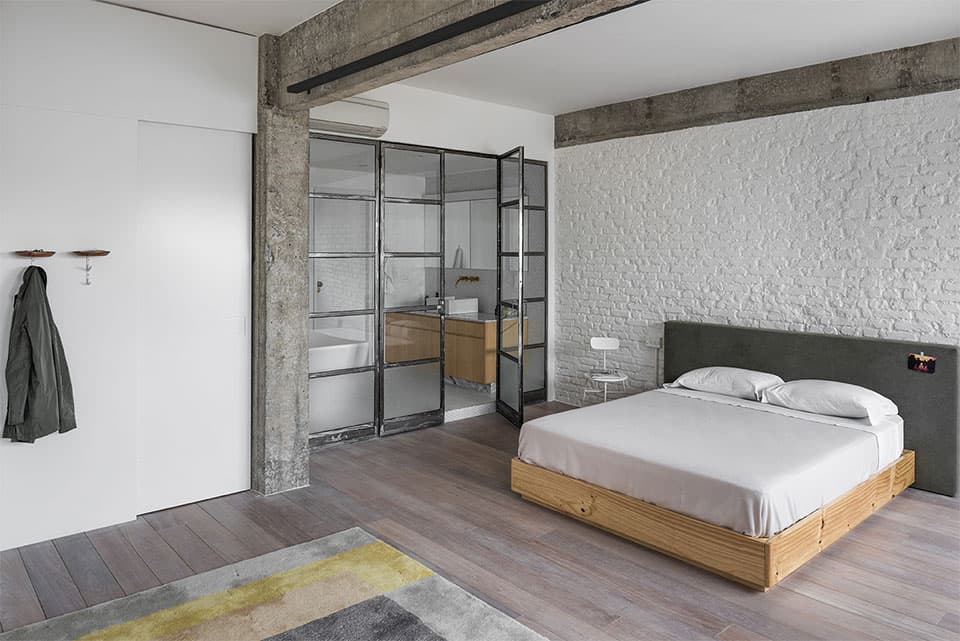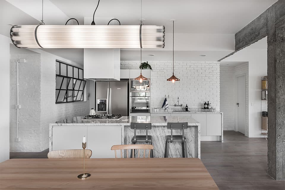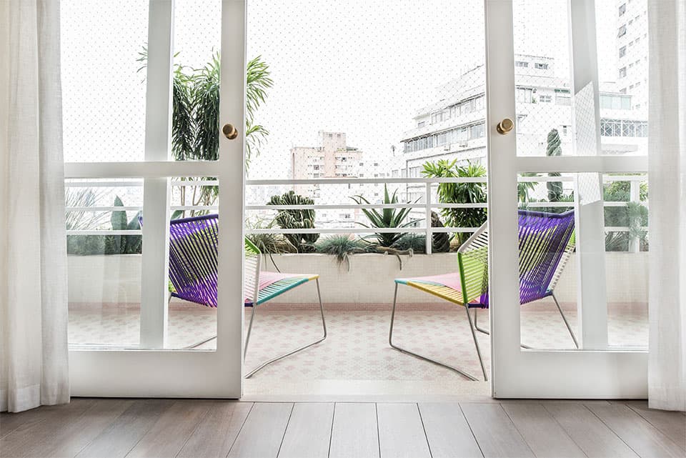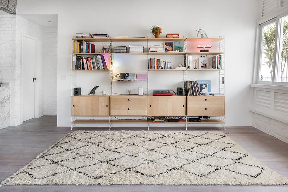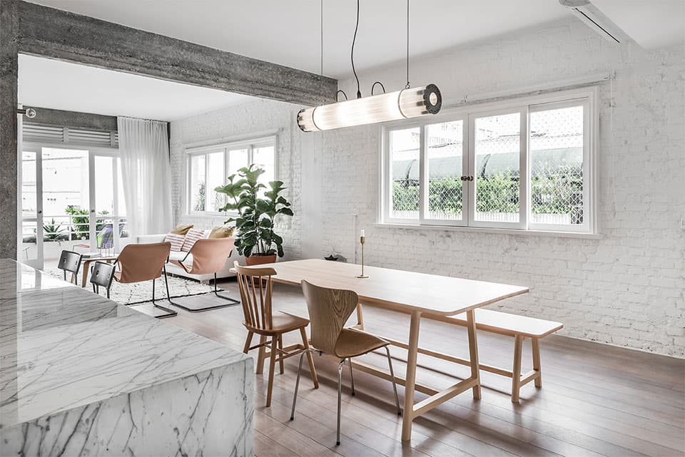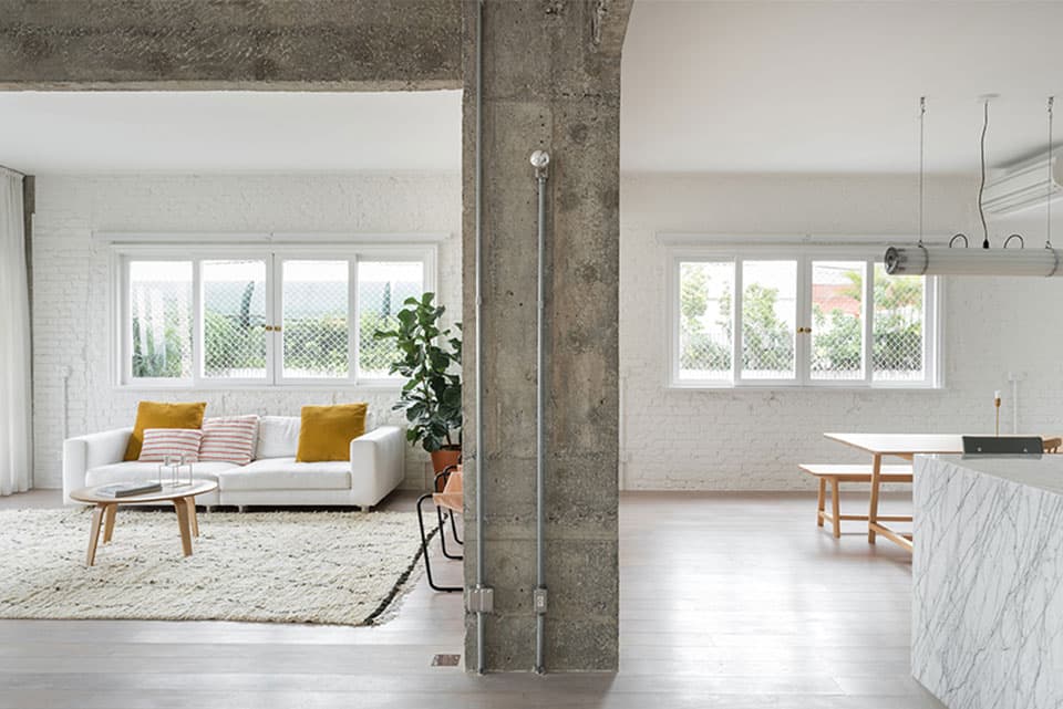 Minimalista e nórdico, com predominância do branco, do concreto, do aço e da madeira clara. Esses foram os conceitos adotados para a idealização do Projeto Parque das Hortênsias pelo PM Arquitetura. O apartamento foi encontrado todo descaracterizado do projeto original, de Artacho Jurado. Estava fragmentado, tinha forro de gesso baixo em todos os ambientes, o que comprimia os espaços. Inicialmente, todas as alvenarias internas, forros, pisos e contrapisos foram demolidos. Além disso, as paredes do entorno do apartamento foram descascadas para que os tijolos originais e suas imperfeições fossem destacadas, bem como os vigamentos e os pilares. Ainda para resgatar parte da antiga identidade, os elementos originais, como o mármore do hall social, a campainha de latão, as luminárias e o ladrilho hexagonal do terraço foram restaurados.