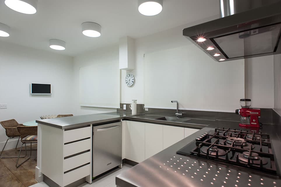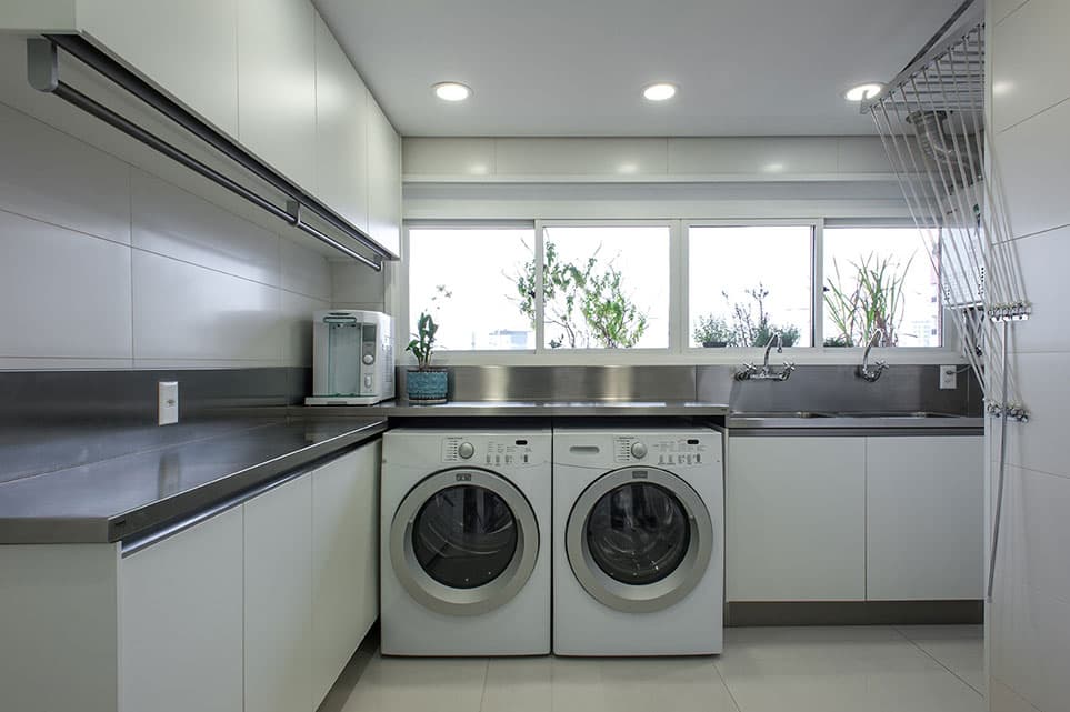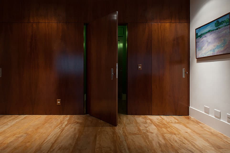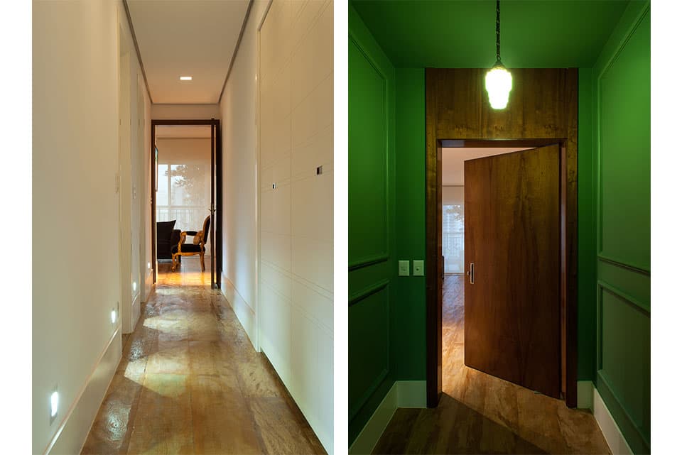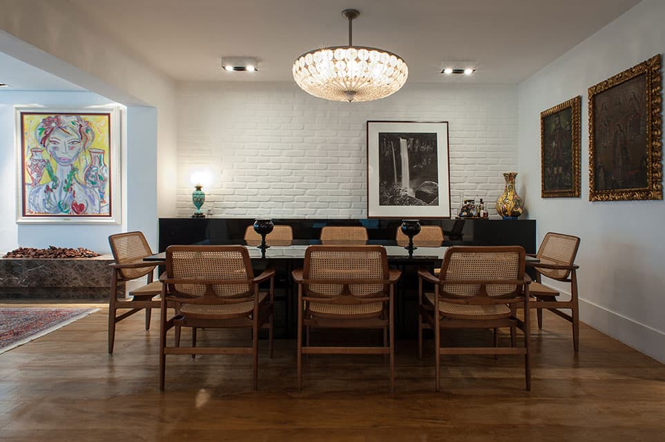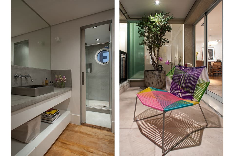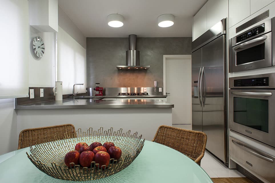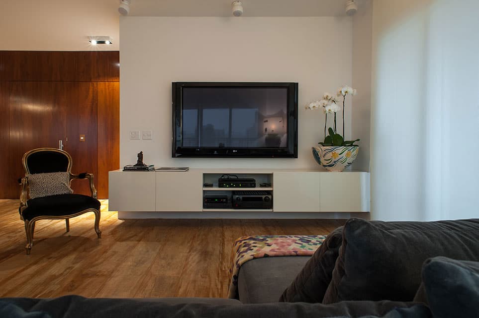 Esse apartamento era novo, com 210m2 e foi entregue pela construtora apenas com os revestimentos básicos. A área social foi ampliada, integrando parte da varanda ao corpo social (antiga área da churrasqueira). As suítes foram reformadas e os espaços, adequados possibilitando a criação de um escritório entre as suítes. A copa e cozinha foram integradas também com o objetivo de ampliar esta área. As bancadas de inox Mekal e a cozinha da Ornare trouxeram um ar sofisticado ao ambiente.