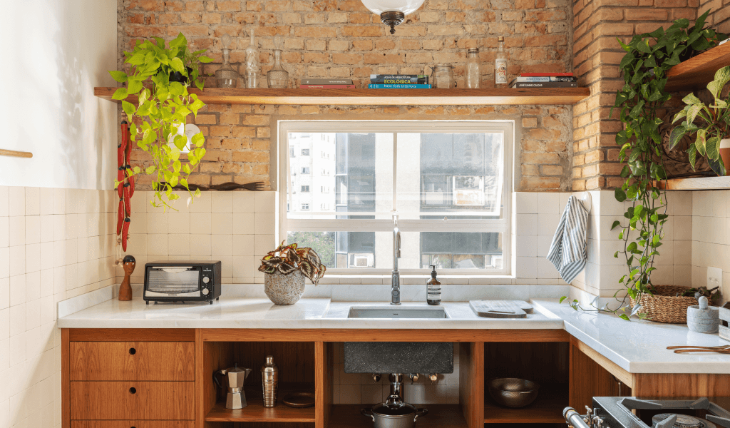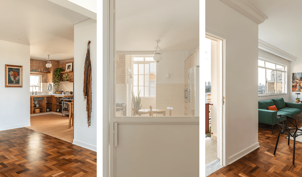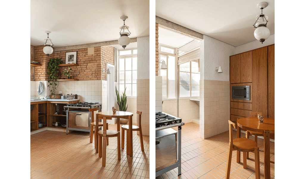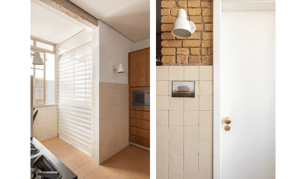 Na área social nosso projeto integrou a cozinha com o hall social em direção a sala de estar, proporcionando mais entrada de luz natural e ventilação cruzada, vinda das janelas e varanda com vista para a praça Vilaboim e Ed. Louveira. Nessa cozinha adotamos um ar industrial, tanto pelos revestimentos e o tijolo aparente original, como por camuflarmos a lavanderia com uma porta de enrolar perfurada.