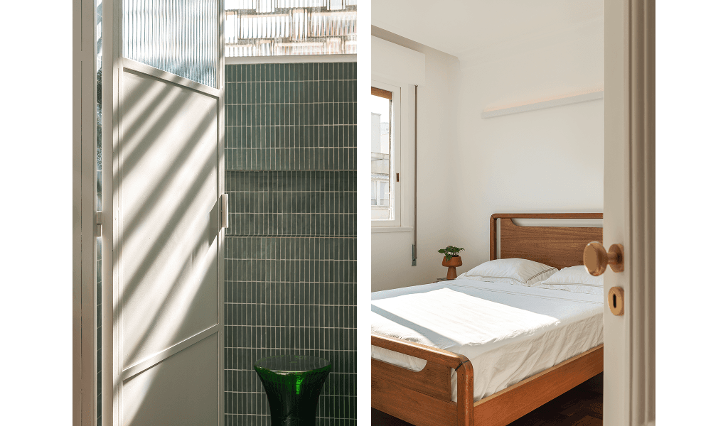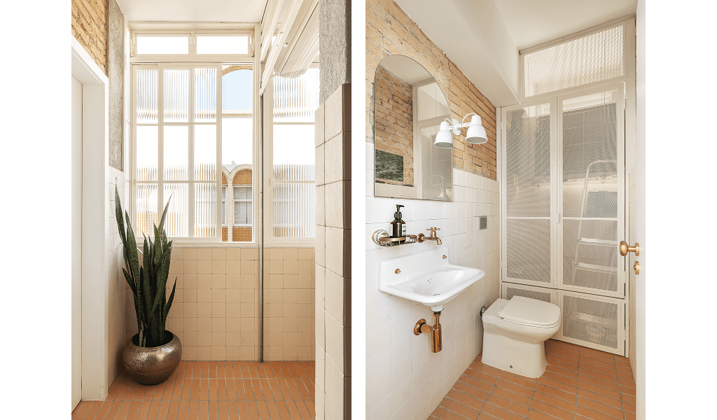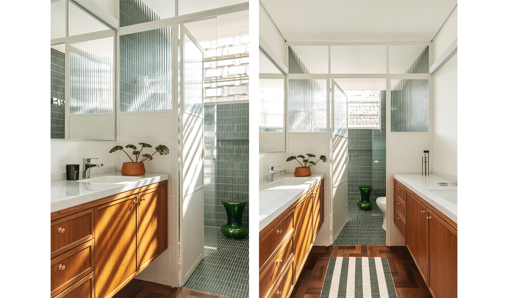 Outra intervenção relevante foi a transformação de dois banheiros compartimentados em uma única grande casa de banho, onde separamos os lavatórios da área mais intima, onde os chuveiros estão localizados, por meio de uma serralheria com iluminação, permitindo o uso de duas pessoas ao mesmo tempo, para atender aos dois dormitórios existentes.
